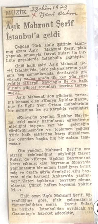 Ünlü halk şalri Âşık Mahzunî Şerif, Istanbul'da plak çalışmalarının yanı sıra boş zamanlarında dostlarıyla görüşmüş ve bu anada ilk kez yüz yüze geldiği S. SERPİL SAVCIOĞLU lle de halk şiirinin güncel sorunları üzerine tartışmıştır.