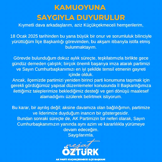 01.01.2025 Tarihinde devraldığım AK Parti Büyükçekmece İlçe Başkanlığı görevimi; İl Başkanlığımızın taktiri ile bugün itibariyle yeni belirlenecek bir arkadaşıma devredeceğim. Bugünden itibaren partimin, teşkilatımın her daim emrinde olacağım.