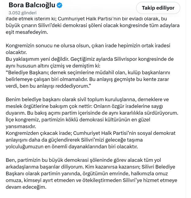 CHP Silivri İlçe Kongresine sayılı günler kala Belediye Başkanı Bora Balcıoğlu’ndan ‘Tarafsızlık açıklaması’ geldi. Balcıoğlu, “Belediye Başkanı; dernek seçimlerine müdahil olan, kulüp başkanlarını belirlemeye çalışan biri olmamalıdır. Bu anlayış geçmişte bu kente zarar verdi, ben bu anlayışı reddediyorum.Kim kazanırsa kazansın; Silivri Belediye Başkanı olarak partimin yanında, örgütümün emrinde, halkımızla omuz omuza, kimseyi ayırt etmeden ve ötekileştirmeden Silivri’ye hizmet etmeye devam edeceğim.”dedi. Başkan Adayı Doruk Bulut, bu açıklamayı etiketleyerek ‘Her zorluğu birlikte aşacağız Bora Başkanım.”dedi.