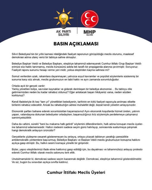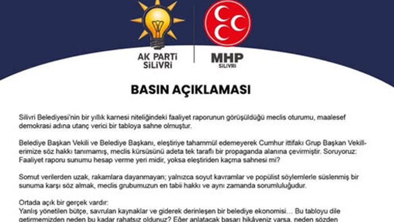 Silivri Belediyesi’nin bir yıllık faaliyet raporunun görüşüldüğü meclis oturumu sonrası Cumhur İttifakı Meclis Üyeleri ortak bir basın açıklaması yaparak kendilerine söz hakkı verilmediğini bunun 'Demokrasi adına utanç verici bir tablo' olduğunu belirttiler.
