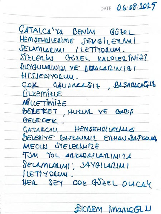 İmamoğlu, ziyarette kendi el yazısıyla Çatalca’ya bir mesaj gönderdi.